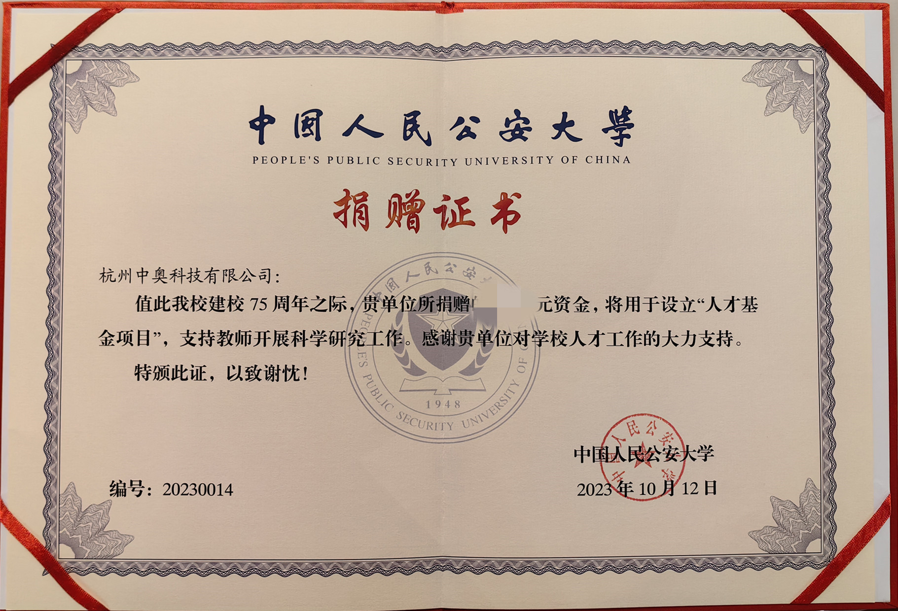 10月12日,在中國人民公安大學迎來75周年校慶之際,由中國教育發展基金會牽頭,中奧科技、科大訊飛、美亞柏科等多家高新技術企業共同發起“人才基金項目”。該基金旨在支持中國人民公安大學人才培養、師資建設,向鍛造一流公安人才隊伍目標邁進。杭州中奧科技有限公司作為該基金成員單位,積極參與該基金的發起與運作,并與中國人民公安大學正式簽約。