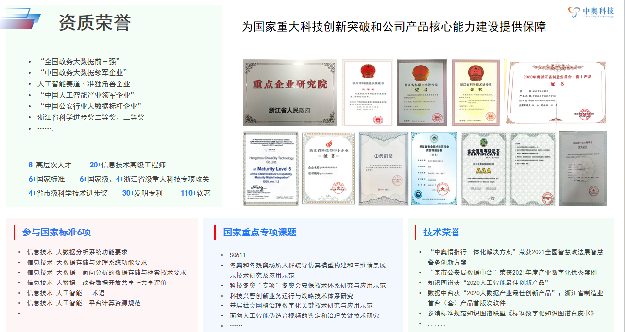 作為國(guó)內(nèi)政務(wù)、政法數(shù)智領(lǐng)軍企業(yè),中奧科技深耕數(shù)智大腦15年,專(zhuān)注于以產(chǎn)品與方案組合方式服務(wù)公安領(lǐng)域 10+ 年,通過(guò)業(yè)務(wù)+數(shù)據(jù)+智能融合方式引領(lǐng)行業(yè)數(shù)智發(fā)展,構(gòu)建生態(tài)合作體系,堅(jiān)持自主創(chuàng)新,擁有 30 +軟件發(fā)明專(zhuān)利、110 +軟著、 創(chuàng)建10 +產(chǎn)學(xué)研聯(lián)合實(shí)驗(yàn)室,沉淀 100 +算法模型及AI應(yīng)用,為杭州G20峰會(huì)、烏鎮(zhèn)互聯(lián)網(wǎng)大會(huì)、2022北京冬奧會(huì)等活動(dòng)提供核心數(shù)智技術(shù)安保服務(wù)。